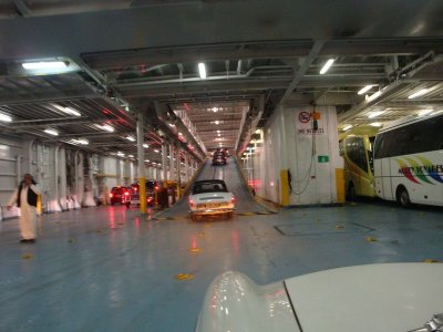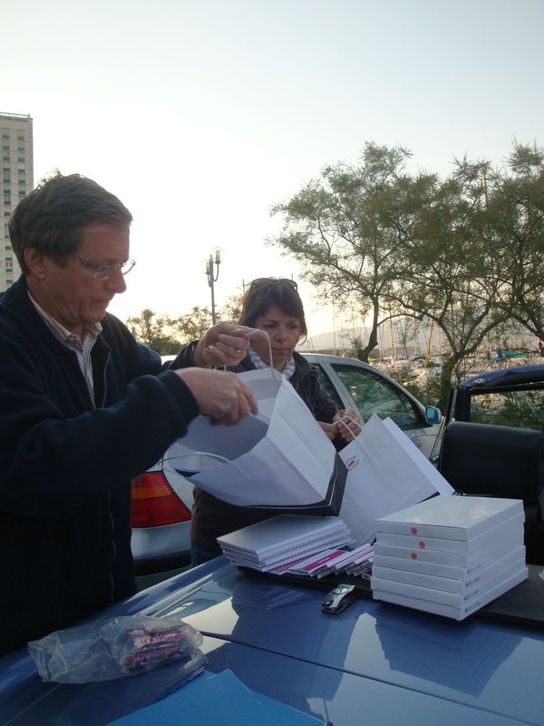 Sur le port on nous annonce un retard de deux heures (Corsica, y font pas grève mais ils ont oublié l’heure...), Philippe, Mylène et Olivier distribuent les pochettes pleines de cadeaux et la documentation de l’agence de voyage.