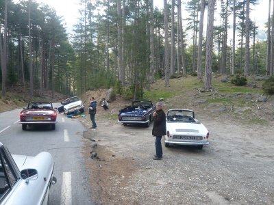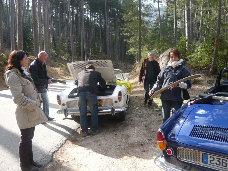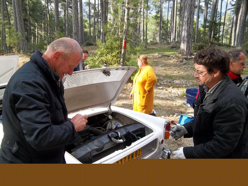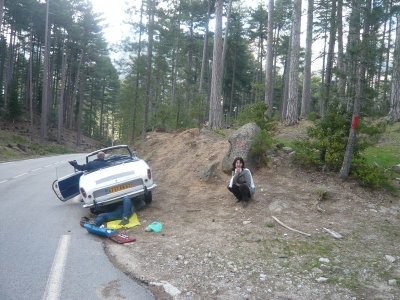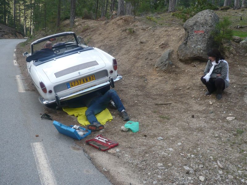 En milieu d’après-midi Richard donne l’alerte. il est dans la descente du col de Vergio avec Guy et Monique dont la caravelle fait un bruit plus qu’inquiétant...