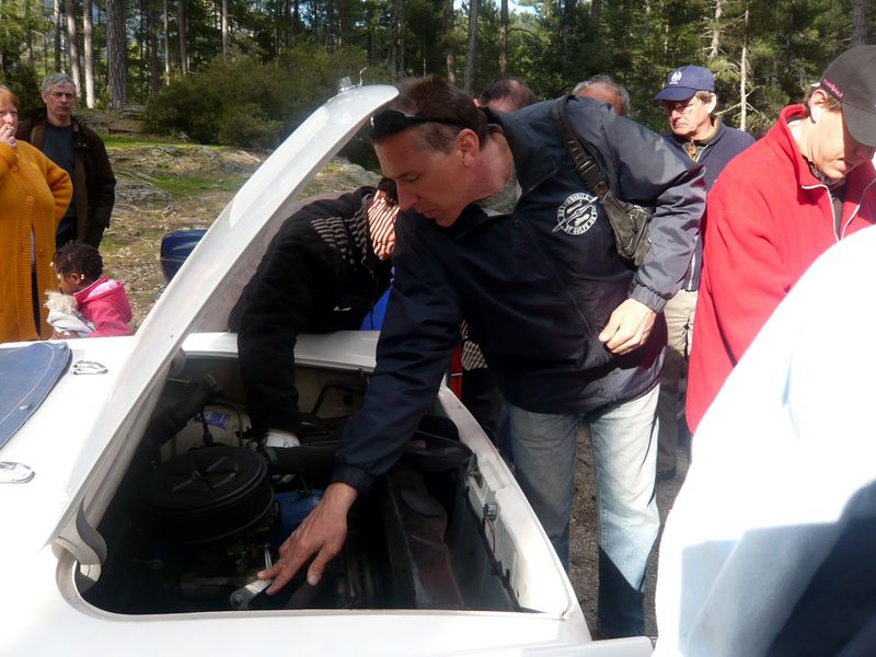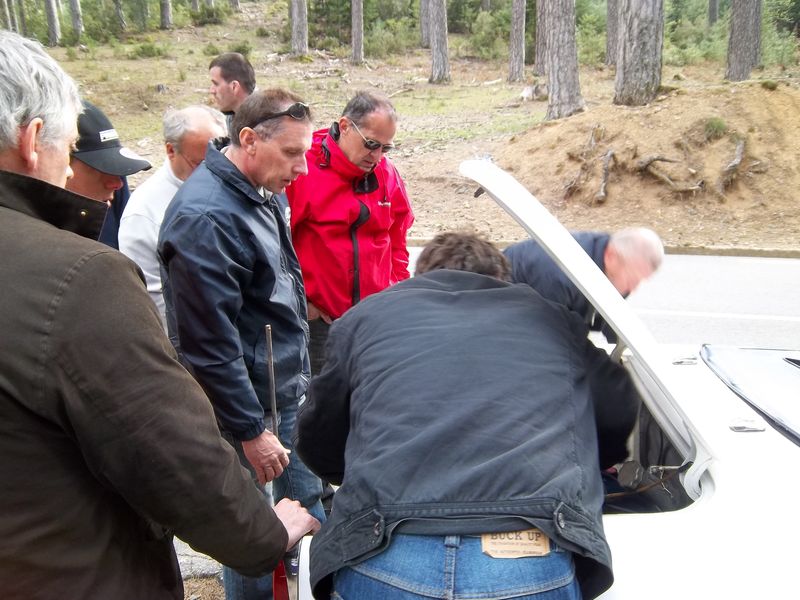 Le groupe se reforme donc sous les arbres centenaires de la forêt d’Aïtone autour de la voiture en panne. Les experts se penchent sur le moteur et finissent par trouver deux bougies détruites.