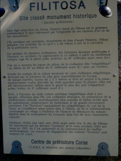Le site de Filitosa offre, à travers ses précieux vestiges, une synthèse des origines de l’histoire en Corse : périodes néolithique (6000-2000) av.J-C), mégalithique (3500-1000), torréenne (1600-800), puis romaine. Le site a été découvert en 1946 par les propriétaires du terrain ; l’archéologue Roger Grosjean y a ensuite consacré son activité de chercheur.