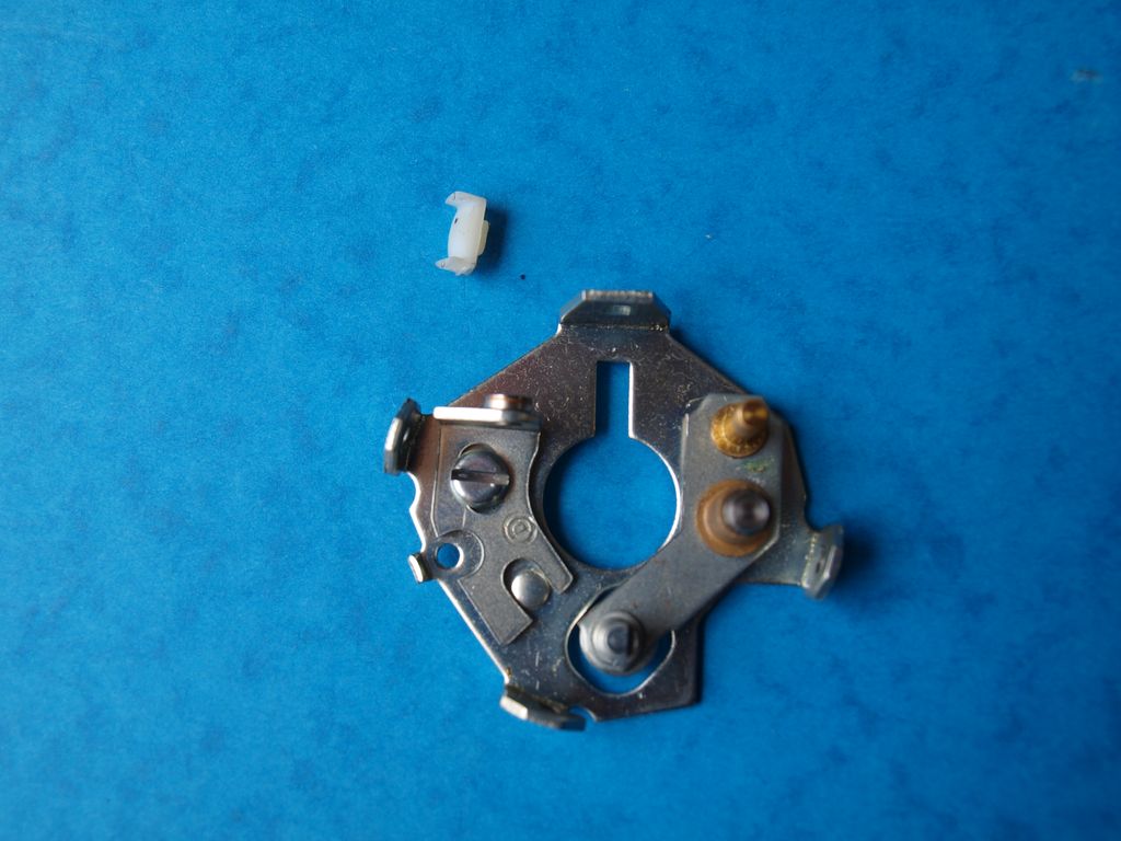 | Le levier actionné par la capsule à dépression, la partie fixe du rupteur. Desserrez la partie fixe du rupteur et faites reculer la platine. |