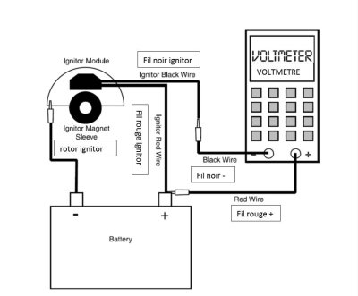 | respecter le schéma de montage, faire tourner le rotor, la tension doit varier à chaque passage d’un des 4 aimants du rotor devant le module . une tension qui reste nulle indique une panne du module ignitor |