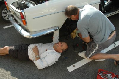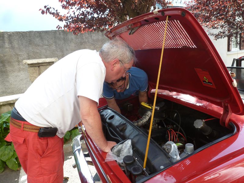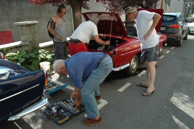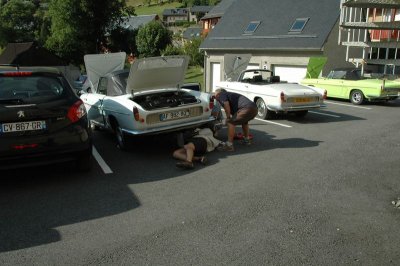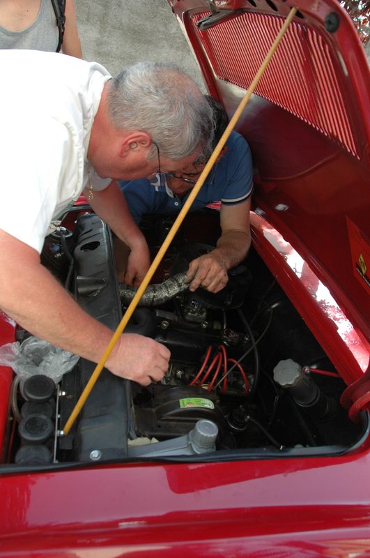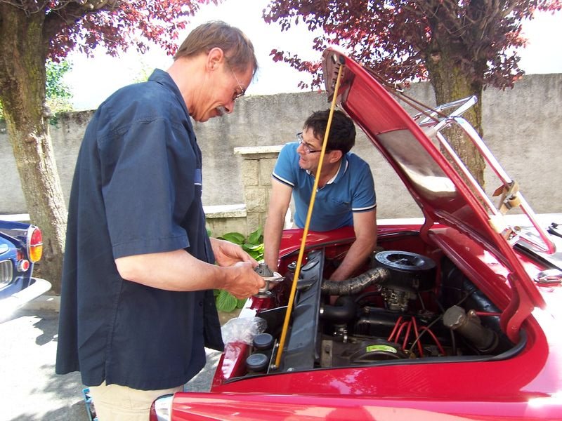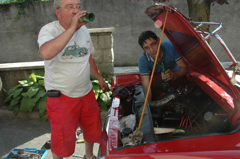 Certains font une petite pause sieste avant le repas, d’autres visitent le village sinistré par les inondations de juin, d’autres font de la mécanique. Le stock de pièces prêté par la société 4A est mis à contribution, une pompe à eau, une bobine. On regarde les freins des voitures les plus sensibles, le tout dans la bonne humeur...