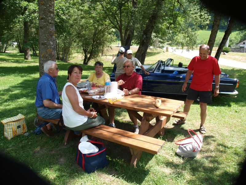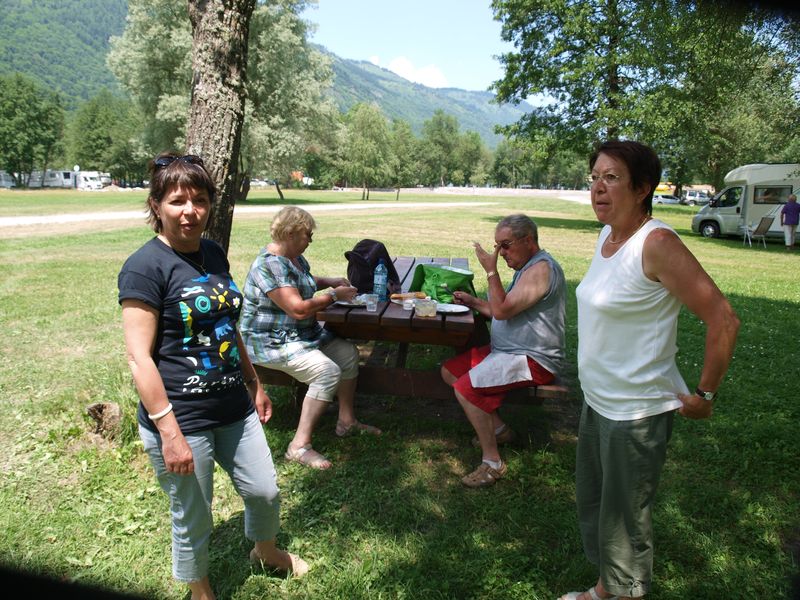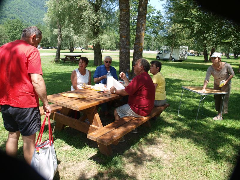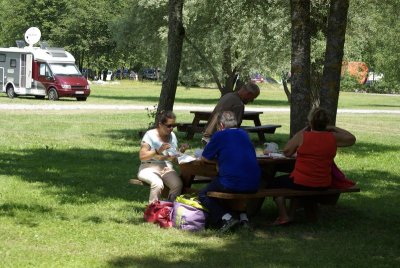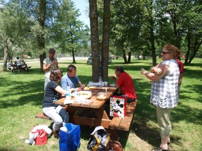 Pique-nique au bord du lac sous les arbres.