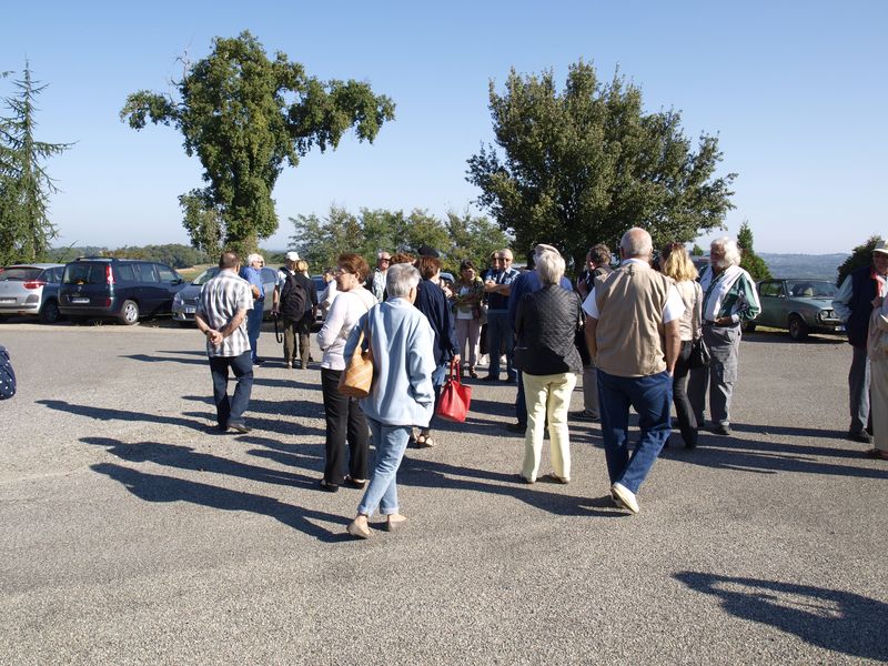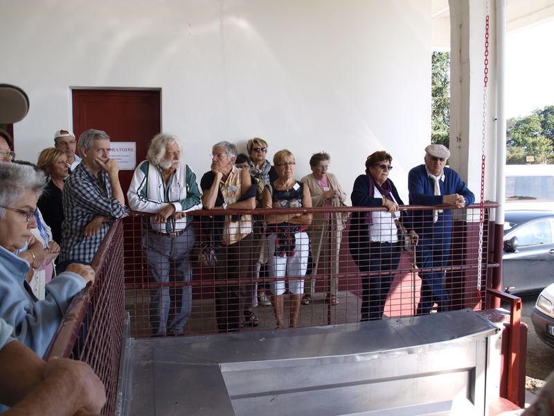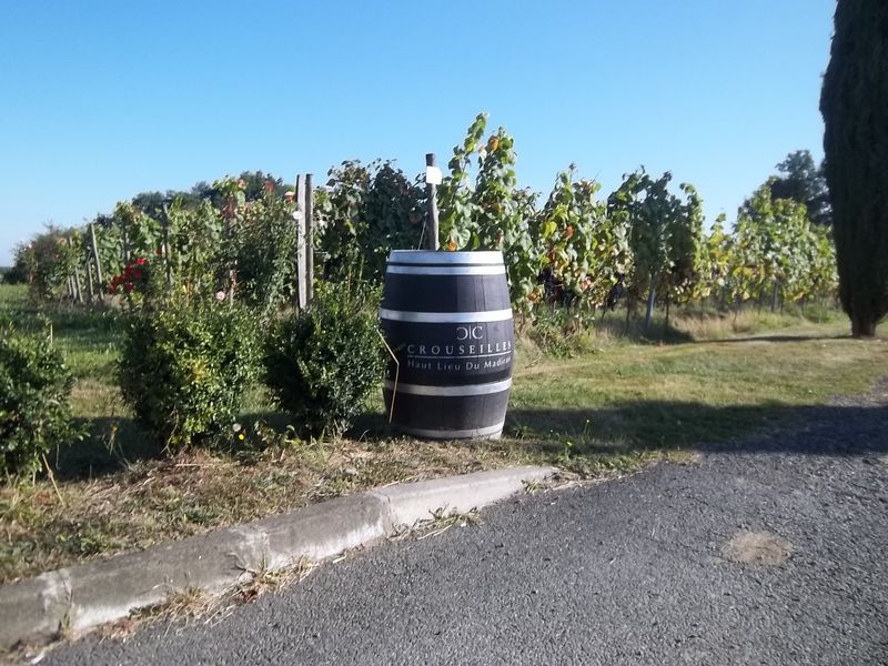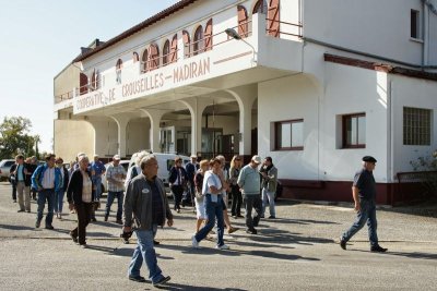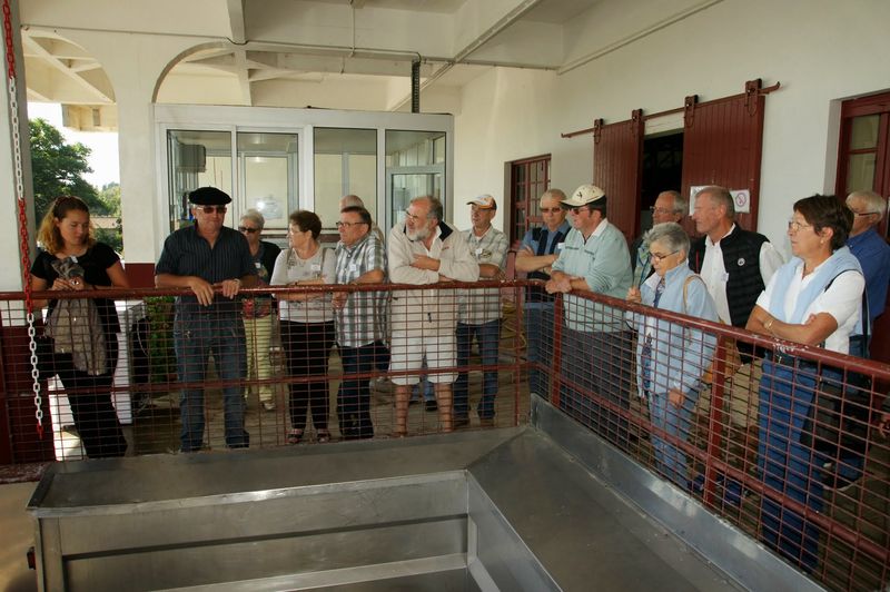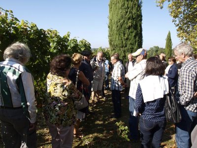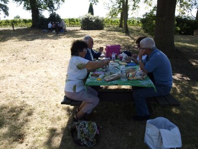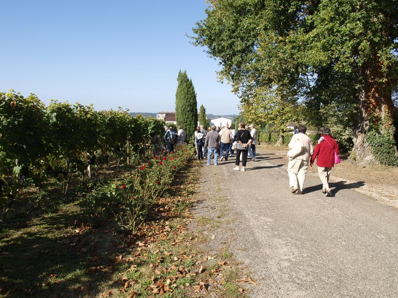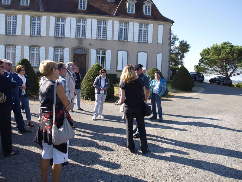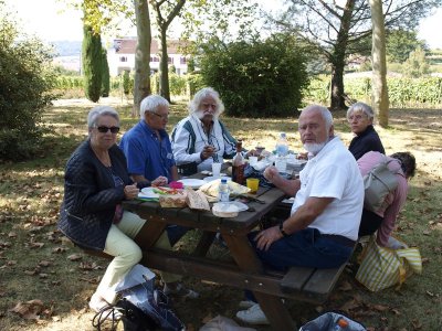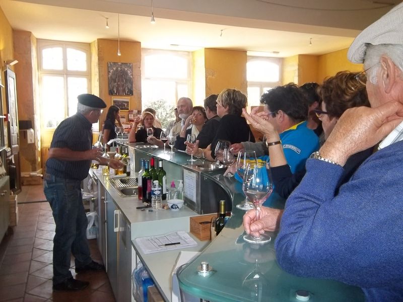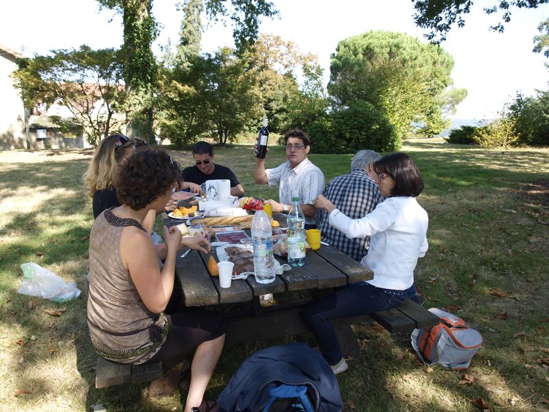 Après un passage dans le magnifique chai aux tonneaux alignés pour le Madiran ou, astucieusement posés sur des roulettes pour affiner le Pacherenc, une dégustation conduit le groupe dans le château qui nous accueille pour notre pique-nique. Nous reprenons la route après un changement de roue suite à crevaison vers le village de Madiran pour un petit café à la terrasse d’un petit bistrot...