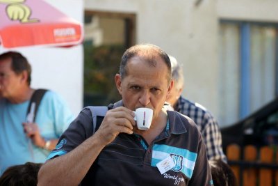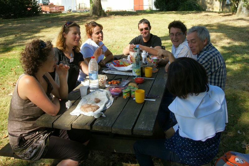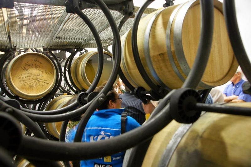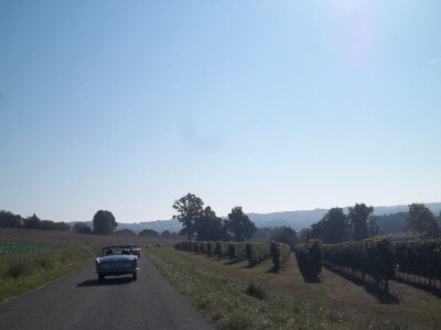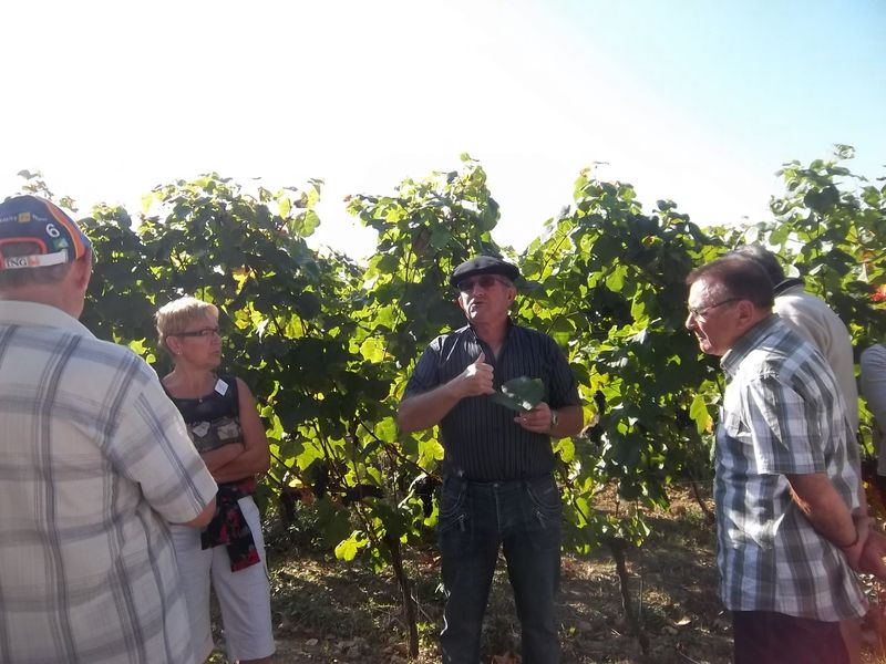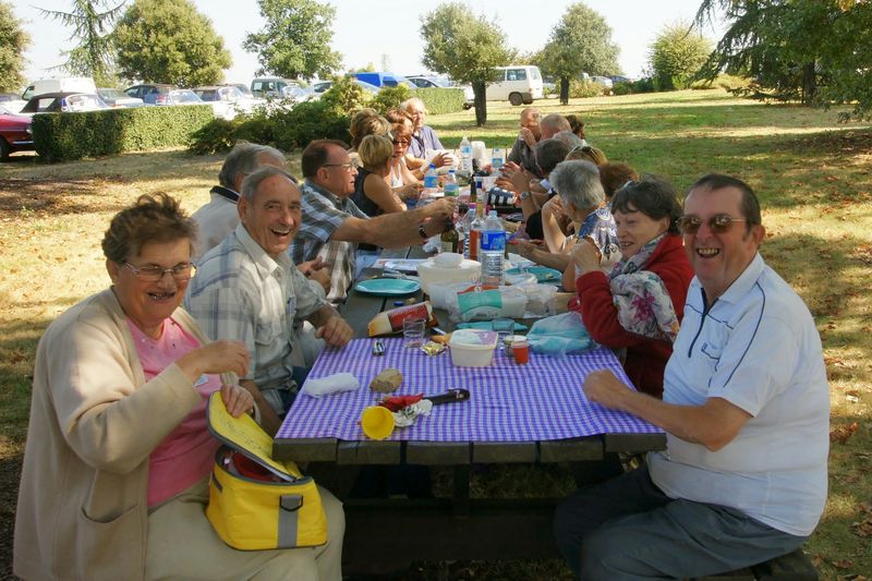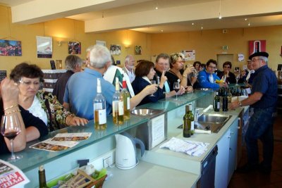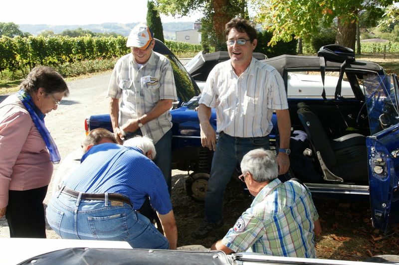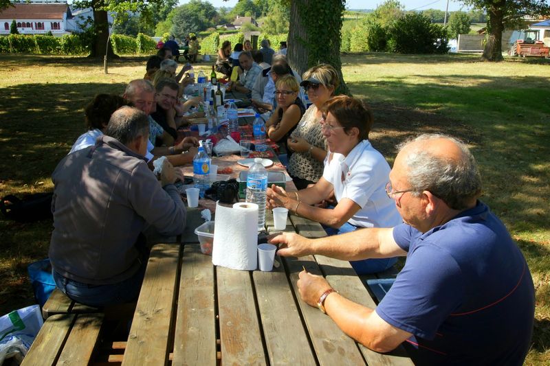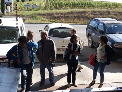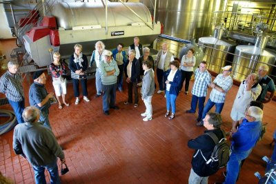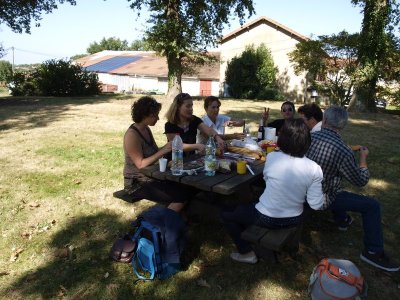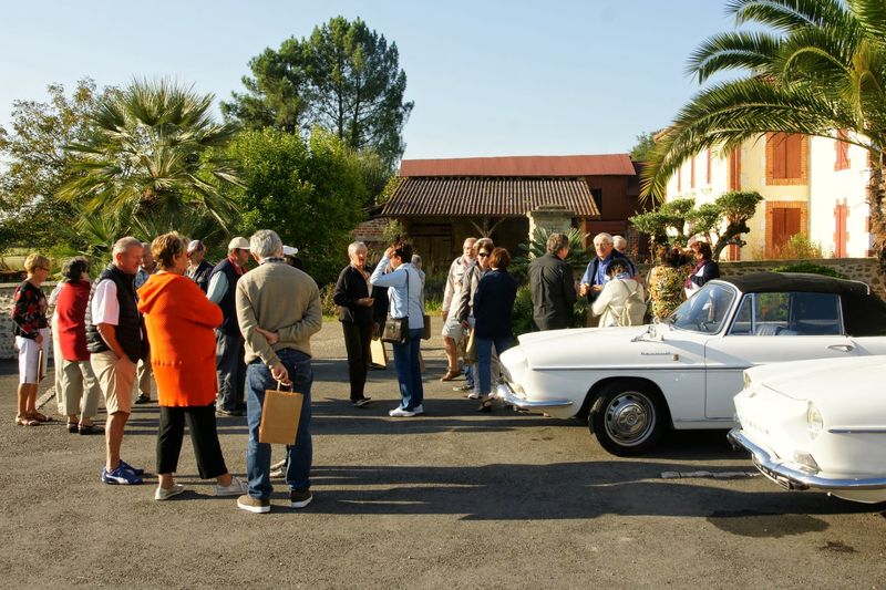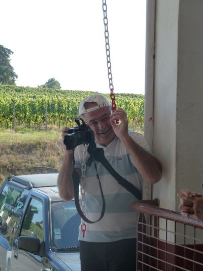 Après un passage dans le magnifique chai aux tonneaux alignés pour le Madiran ou, astucieusement posés sur des roulettes pour affiner le Pacherenc, une dégustation conduit le groupe dans le château qui nous accueille pour notre pique-nique. Nous reprenons la route après un changement de roue suite à crevaison vers le village de Madiran pour un petit café à la terrasse d’un petit bistrot...