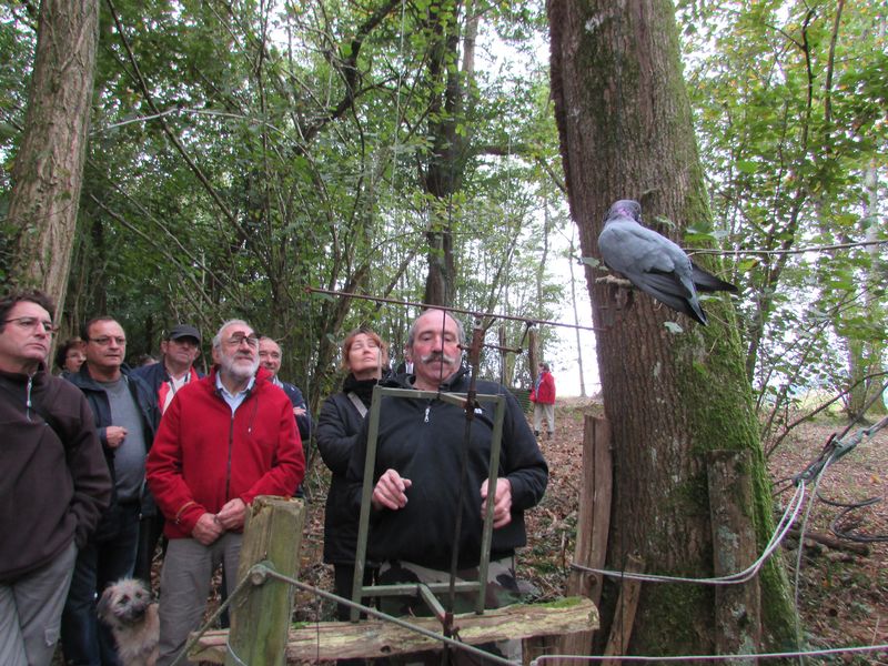Dans les arbres voisins, les chasseurs mettent en place des pigeons dressés les "appelants". Ils sont placés sur une sorte de balançoire commandée par une ficelle depuis le sol. En tirant sur la ficelle , l’oiseau descend et se met à battre des ailes.