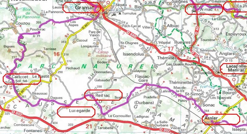 Vers Gramat Les villages s’enchainent sous un soleil de plomb, Reilhac, Lunegarde, Carlucet, Gramat...