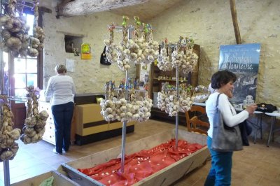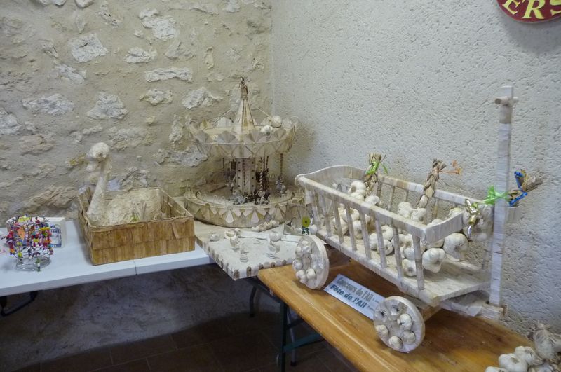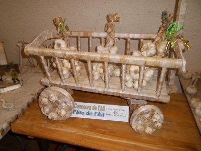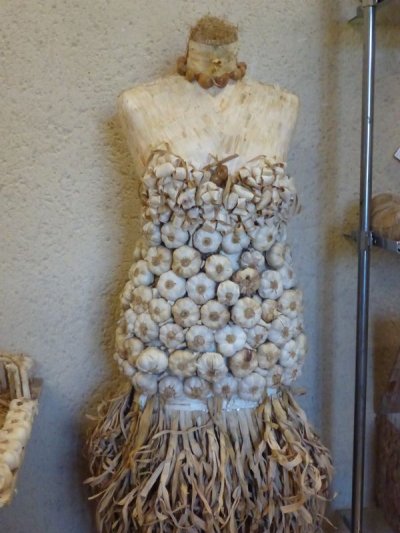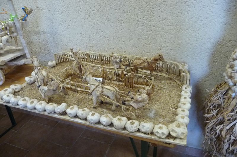 Pour l’ail à consommer, ce n’est pas encore la saison mais on peut admirer une belle exposition d’œuvres en peau et feuilles d’ail réalisées à l’occasion des fêtes de l’Ail.
