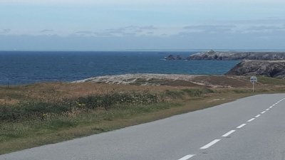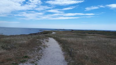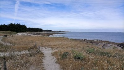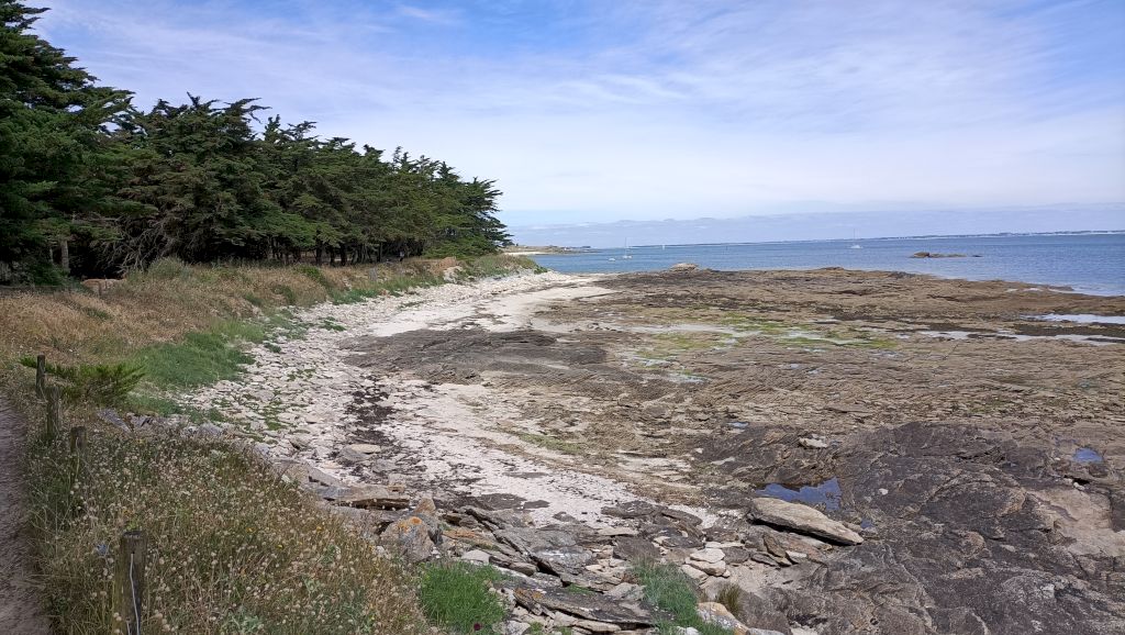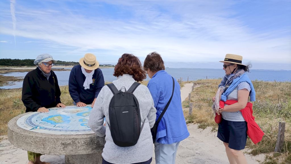 Le piquenique est prévu à la pointe du Conguel au sud de la presqu’île, sur une aire aménagée à l’ombre. Un petit vent accélère le repas et une promenade pédestre jusqu’à la pointe s’organise. Une table d’orientation permet de situer les îles environnantes.