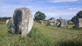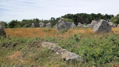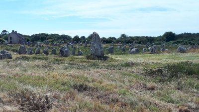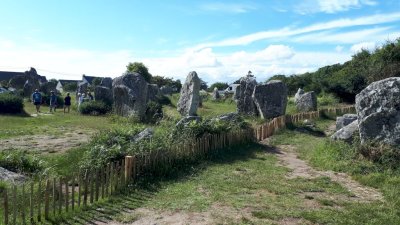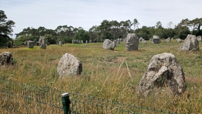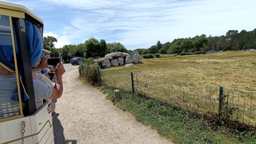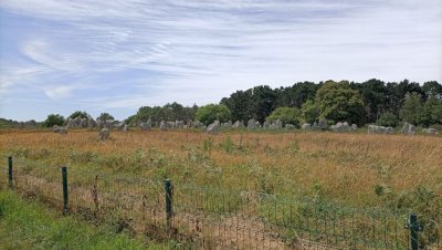 Sortie de la presqu’ile direction Carnac et ses champs de mégalithes. L’excursion en petit train nous fait découvrir l’ensemble du site, hélas très clôturé... Le retour vers Erdeven permet un arrêt plus tactile avec ces pierres mystérieuses sur un site libre d’accès à l’entrée du village.