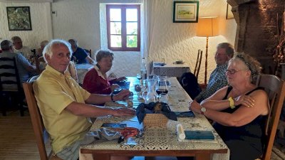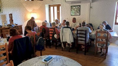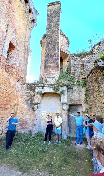- Mais la journée n’est pas terminée, en route vers le château Le Paluel, propriété de notre Hôte, Etienne Cluzel. Visite guidée par lui-même malgré le téléphone qui le rappelle vers ses fourneaux ! La passion des pierres l’emporte et il nous emmène avec lui dans tous les coins et recoins de sa très belle demeure martyrisée qu’il a à cœur de restaurer dans les années futures. Vu ce qu’il a déjà réalisé nous n’avons pas de doutes sur le résultat !